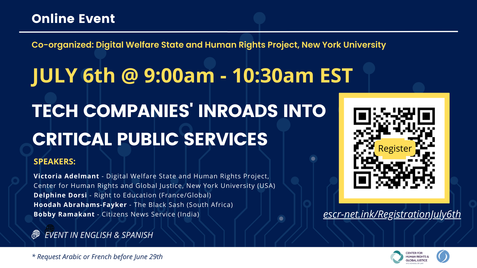 On 6 July, ESCR-Net held an online discussion entitled ‘Tech companies' inroads into critical public services’. Delphine Dorsi, RTE’s Executive Director, presented information regarding educational technology and the right to education, alongside speakers including Victoria Adelman, of the Digital Welfare State and Human Rights Project, Centre for Human Rights and Justice, New York University; Hoodah Abrahams-Fayker, the Black Sash (South Africa); and Bobby Ramakant, Citizens News Service (India).