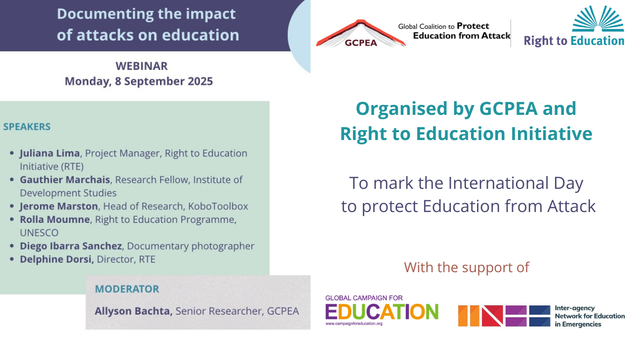 On 8 September 2025, on the eve of the International Day to Protect Education from Attack, the Right to Education Initiative (RTE), together with the Global Coalition to Protect Education from Attack (GCPEA), and the support of the Inter-agency Network for Education in Emergencies (INEE), and the Global Campaign for Education (GCE), hosted a webinar on ‘Documenting the Impact of Attacks on Education.’